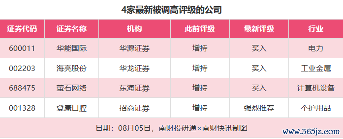 评级调高方面,配资论坛APP下载8月5日,券商调高上市公司评级达到4家次,最新数据包括了华源证券对华能国际的评级从“增持”调高至“买入”,华龙证券对海亮股份的评级从“增持”调高至“买入”,东海证券对萤石网络的评级从“增持”调高至“买入”。
