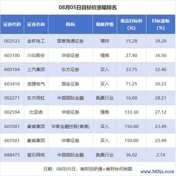 南财投研通数据显示,8月5日,券商给予上市公司目标价共9次,按最新收盘价计算,目标价涨幅排名居前的公司有金杯电工、川仪股份、上汽集团,目标价涨幅分别为39.29%、36.56%、32.46%,分别属于电网设备、通用设备、乘用车行业。