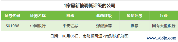 评级调低方面,8月5日,券商调低上市公司评级达到1家次,最新数据包括了平安证券对中国银行的评级从“强烈推荐”调低至“推荐”。