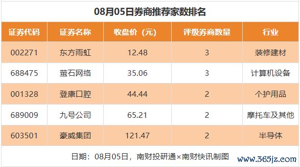 从券商推荐家数来看,实盘配资平台查询8月5日有35家上市公司得到券商推荐,其中东方雨虹获得3家推荐,萤石网络获得3家推荐,登康口腔获得2家推荐。